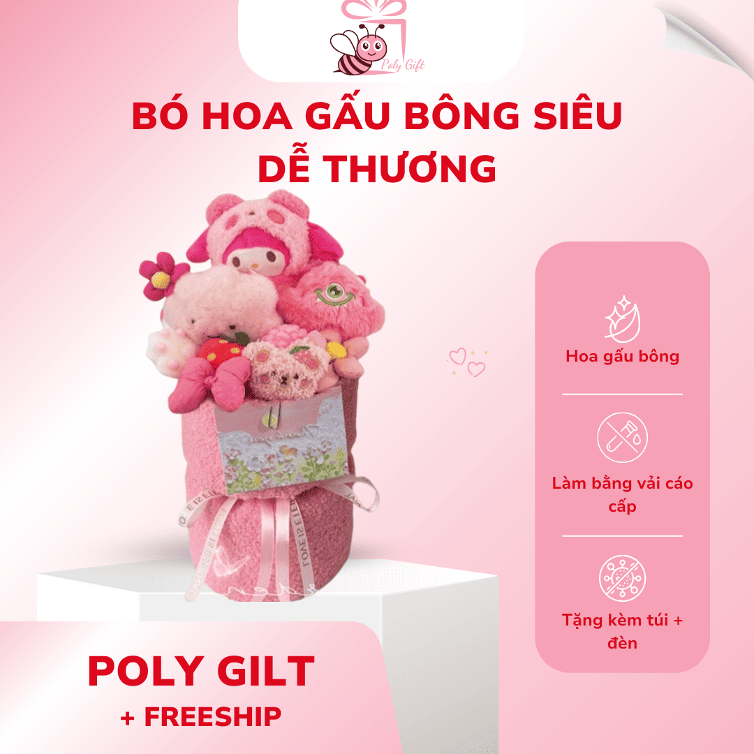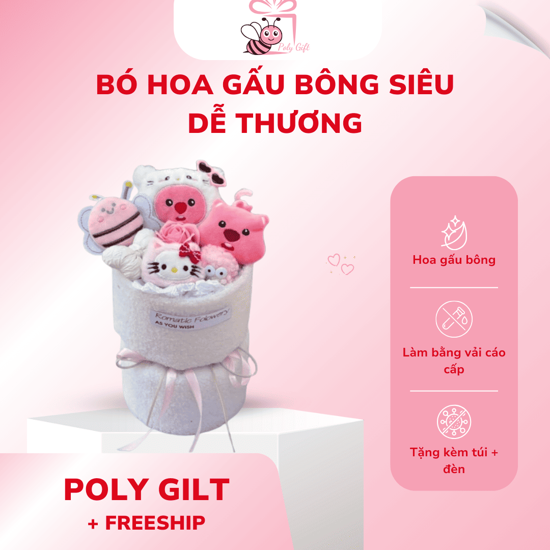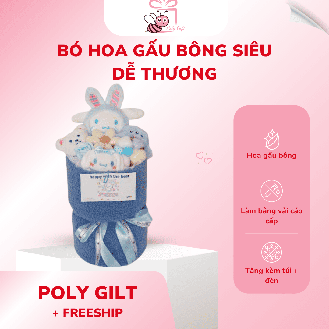 – Bó hoa gấu bông được thiết kế với các màu sắc, hình dáng đa dạng và vô cùng dễ thương như Kuromi, Lotso, Pooh…